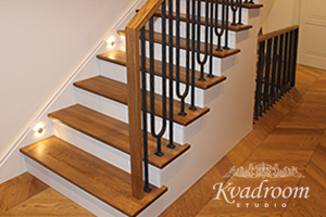 Материалы - массив дуба, лак, эмаль, кованые балясины.