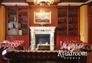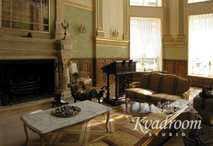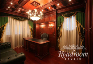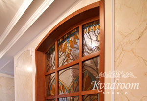 В отделке интерьера и производстве мебели использованы ценные породы дерева - дуб, орех. Витражи в стиле Тиффани.